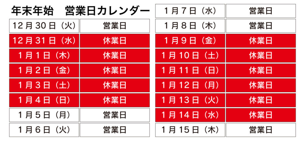 臨時休業日 1月9日(金) ~ 1月14日(水)
